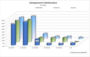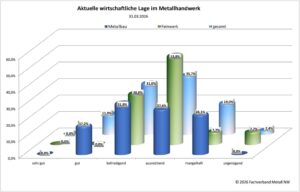 Die eigene wirtschaftliche Lage wird von gut einem Fünftel der Metaller als mangelhaft oder schlechter eingeschätzt, für vier von zehn metallhandwerklichen Betrieben ist sie zumindest befriedigend oder besser. Auffallend ist, dass inzwischen auch ein Viertel der Metallbauer die aktuelle wirtschaftliche Lage ihrer Betriebe als mangelhaft einschätzt. Nicht zuletzt der Rückgang des Auftragsbestandes bei sechs von zehn Metallhandwerkern hat zu dieser herausfordernden Lageeinschätzung beigetragen.