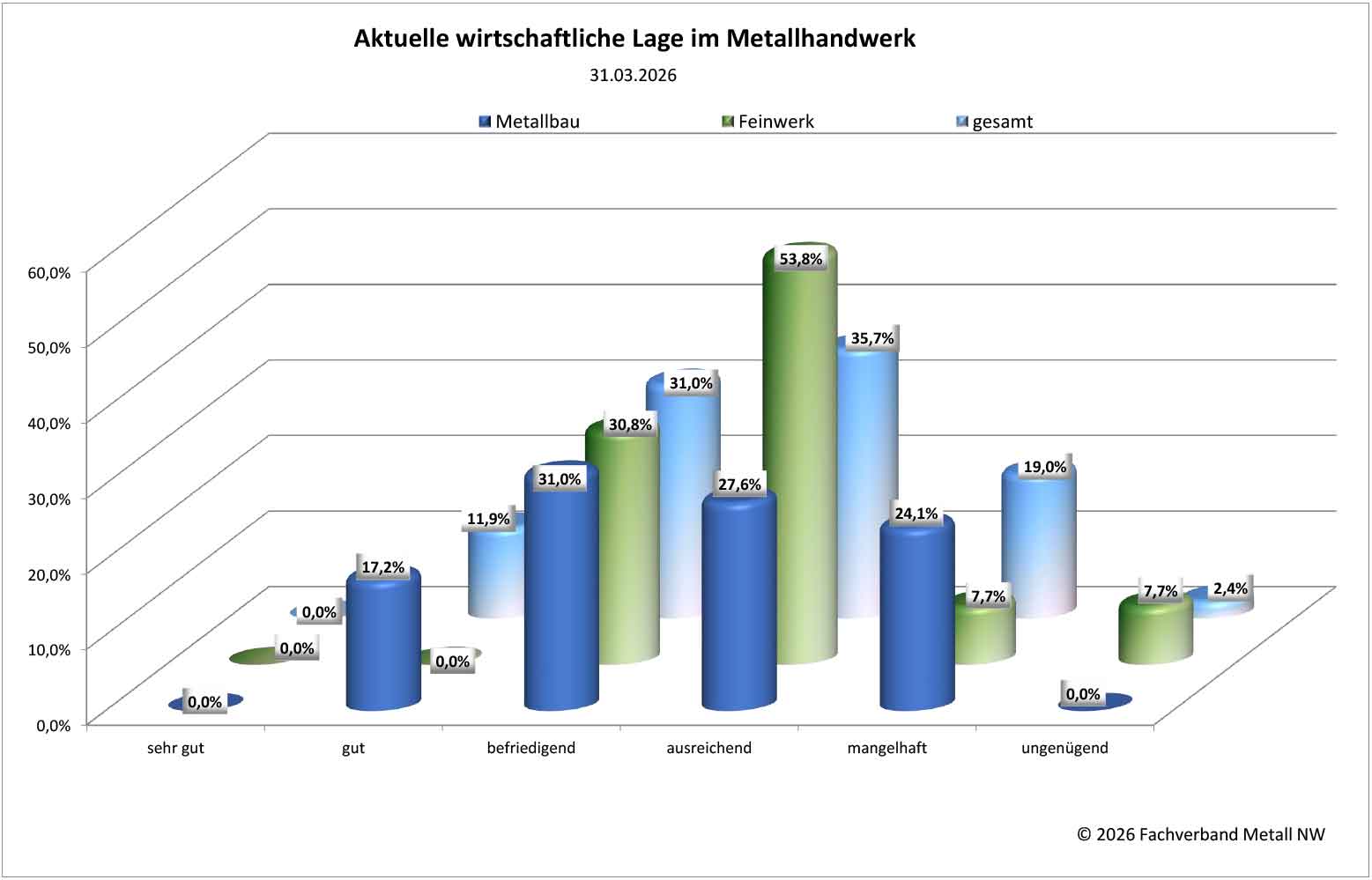 „Rund einen Monat nach Beginn der kriegerischen Auseinandersetzungen im Mittleren Osten zeigt sich auch das Metallhandwerk hiervon nachhaltig betroffen. Nicht nur die direkten Auswirkungen durch die deutlich gestiegenen Treibstoffkosten belasten die Unternehmen, gerade die wieder zunehmende Zurückhaltung bei Investitionsentscheidungen belastet unsere Mitglieder“, kommentiert Stephan Lohmann, Geschäftsführer des Fachverbandes Metall NW, die aktuellen Ergebnisse. „Auftragsstornierungen und ein weiteres Verschieben von Auftragserteilungen sind gerade für unsere Maschinen- und Anlagenbauer eine große Herausforderung. Dass jetzt auch die zumeist am heimischen Markt operierenden Metallbauer zu knapp 60 % den Auftragsmangel als zentrale Herausforderung kennzeichnen, trägt zum stark durchwachsenen Bild unserer Branche bei.“